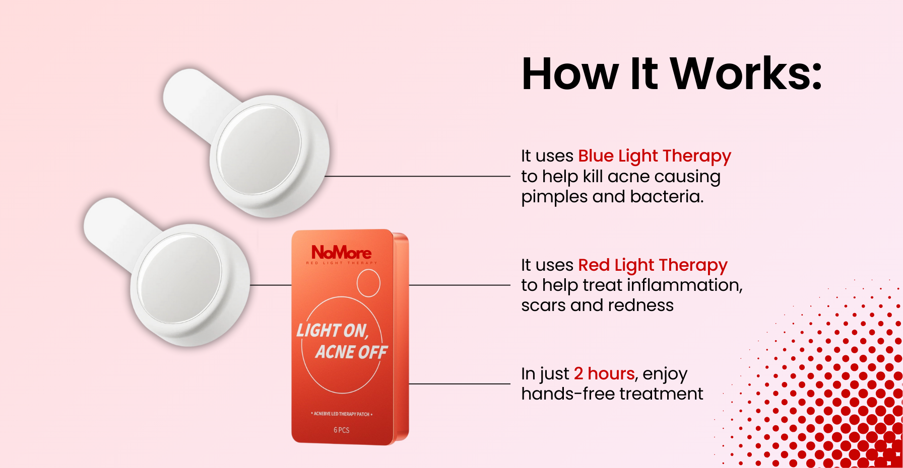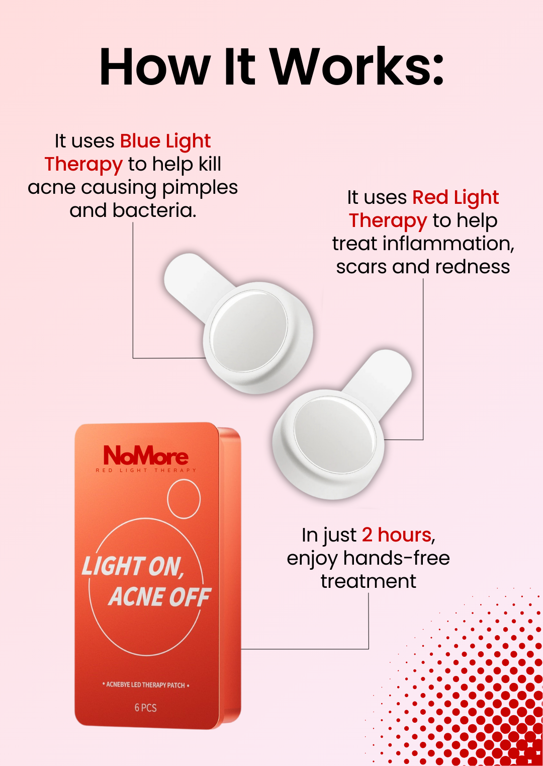 The NoMore® Acne patch uses both blue light and red light therapy, each serving different purposes:
